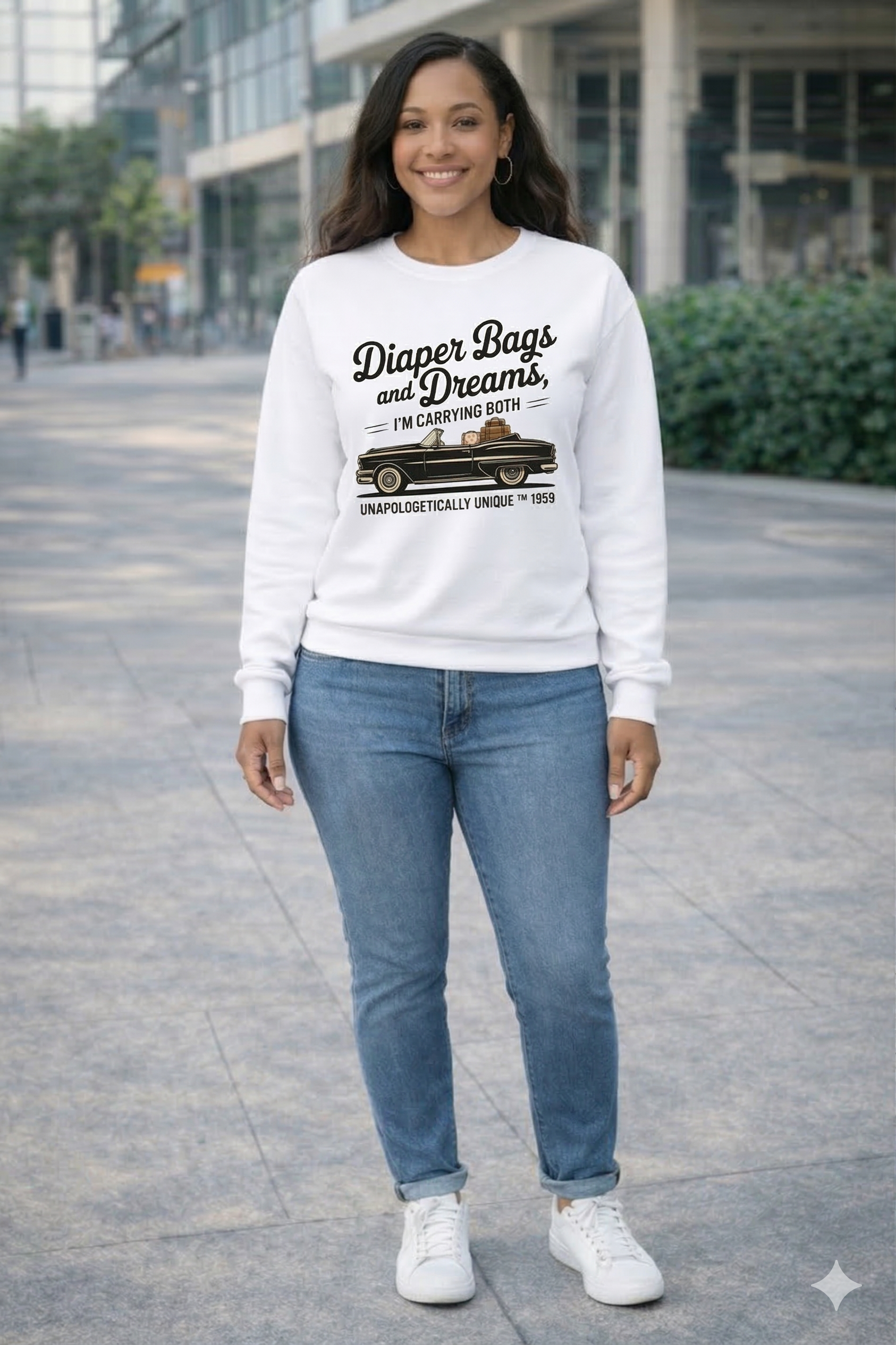 A cozy Diaper Bags and Dreams graphic sweatshirt celebrating the balance of motherhood and ambition. Perfect for moms who carry both responsibilities and dreams with confidence and style.