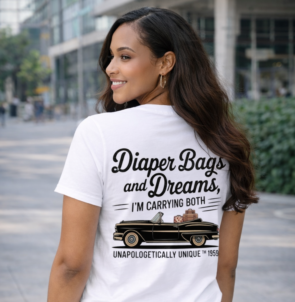 A stylish and meaningful Diaper Bags and Dreams graphic t-shirt designed for proud moms who balance motherhood and big dreams. Comfortable, unique, and perfect for everyday casual wear.