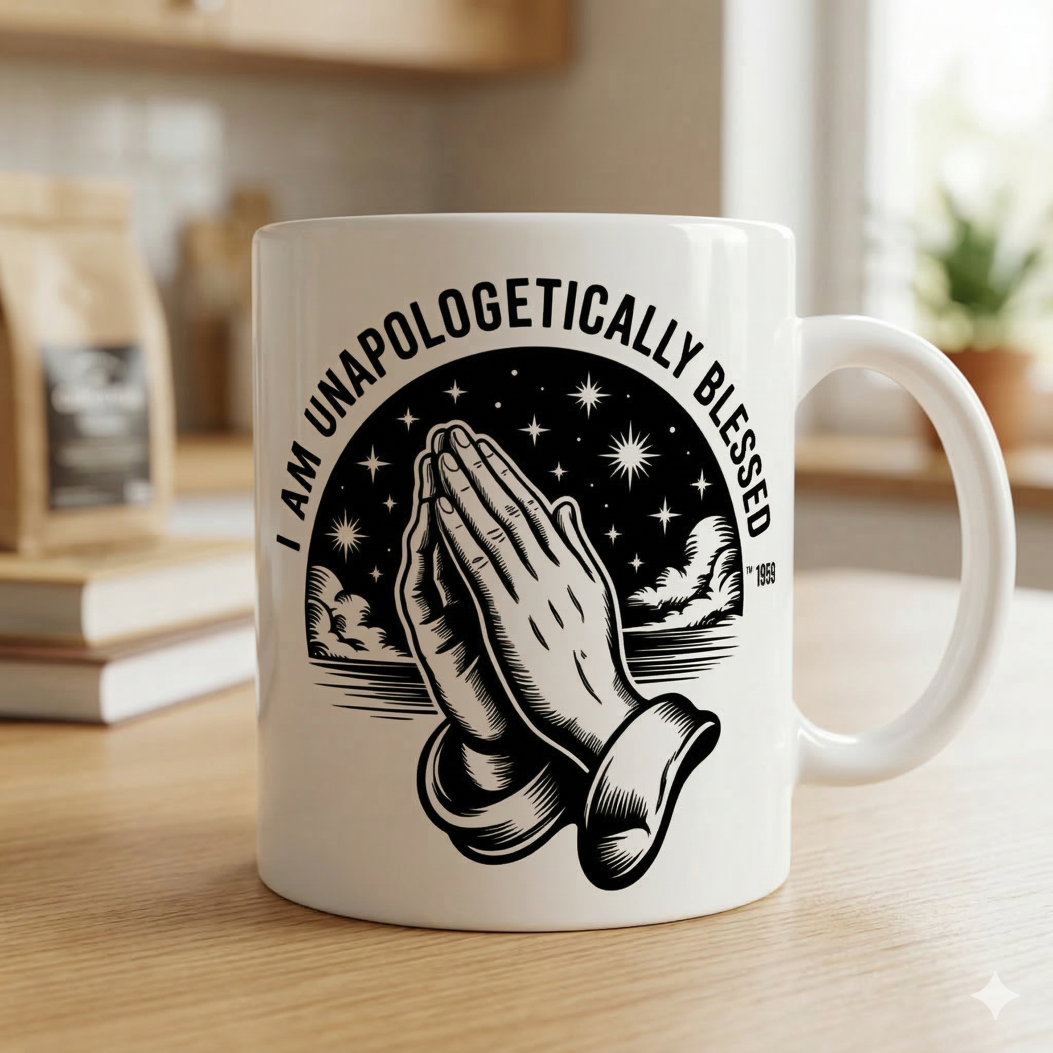 An inspiring faith-based coffee mug featuring praying hands and the message “I Am Unapologetically Blessed.” Perfect for coffee, tea, or devotional moments.
