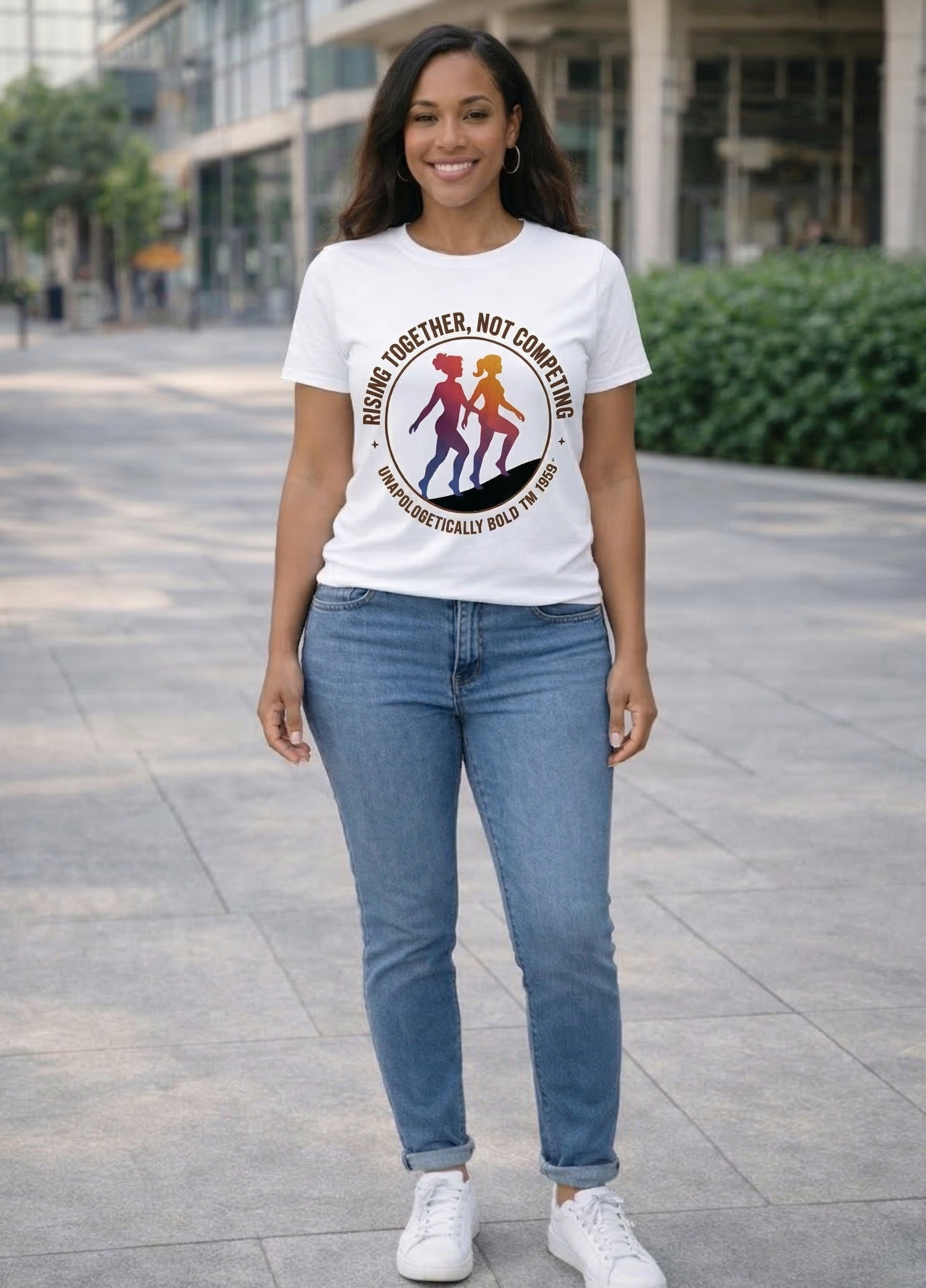 A powerful women empowerment graphic t-shirt featuring the inspiring message “Rising Together, Not Competing – Unapologetically Bold.” Perfect for celebrating unity, strength, and supporting women lifting each other up.