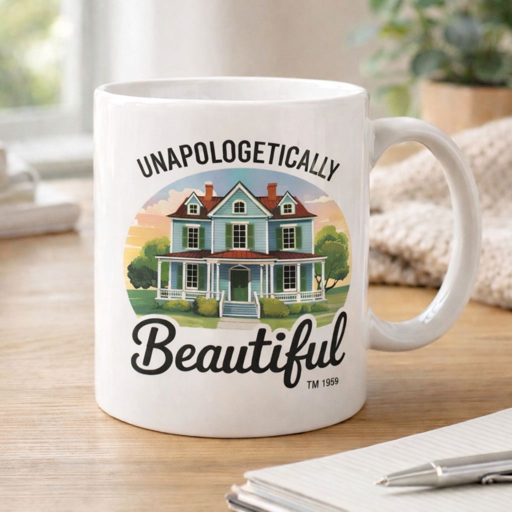 A stylish Unapologetically Beautiful mug featuring a charming house illustration that celebrates comfort, home, and self-expression. Perfect for enjoying coffee, tea, or hot chocolate in style.