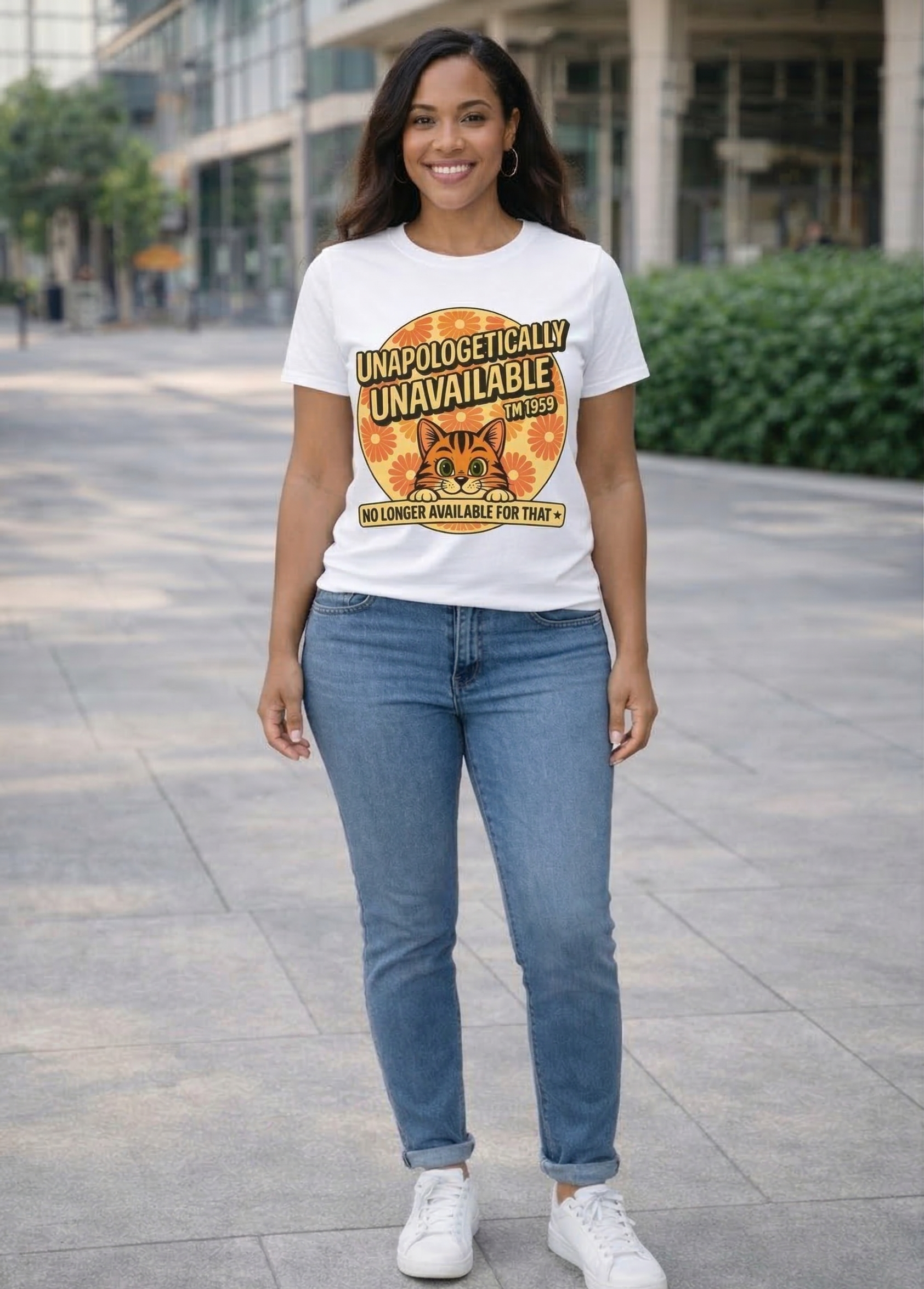 A fun and bold Unapologetically Unavailable graphic t-shirt featuring a cute cat design and playful message. Perfect for cat lovers with a sense of humor who enjoy stylish and expressive casual wear.